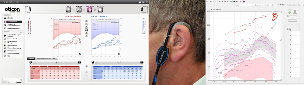 Ein weiterer Faktor ist das Einmessen der Hörgeräte am Ohr. Die Grundeinstellung eines Hörgerätes wird am Computer vorberechnet. Der Computer weiß zwar, wie der Betroffene hört und welche Hörgeräte angepasst werden. Er kennt aber nicht die jeweilige Akustik des Ohres und die exakte Übertragung des Hörgerätes. Bei modernen Anpassverfahren wie z.B. der Perzentilanalyse wird der Schall vor dem Trommelfell gemessen. So sieht der Akustiker, ob die Verstärkung auch wie berechnet ankommt und kann damit das Hörgeräte gezielter einstellen.